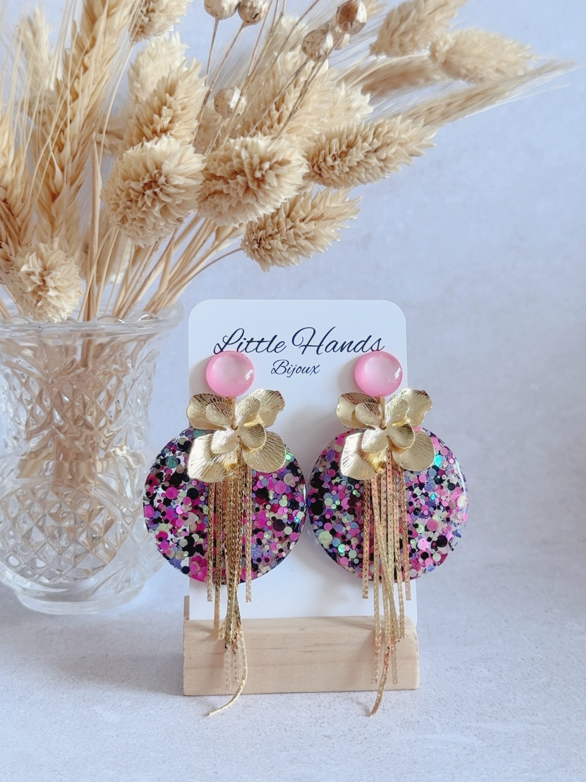 Le rond en résine pailletée capte la lumière à chaque mouvement et apporte cette touche unique propre à Little Hands Bijoux : de la couleur, de la brillance… et beaucoup de bonne humeur 💛